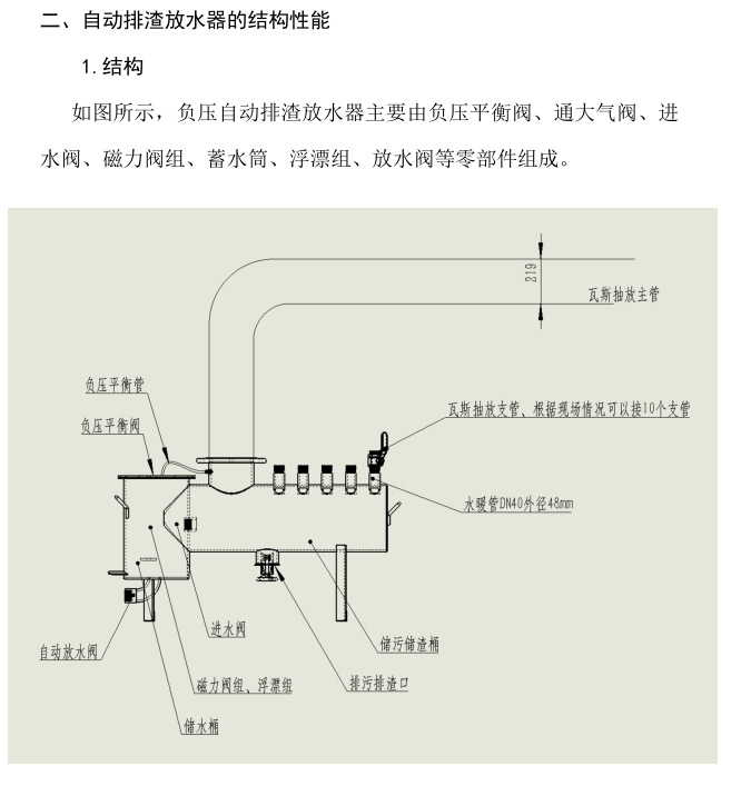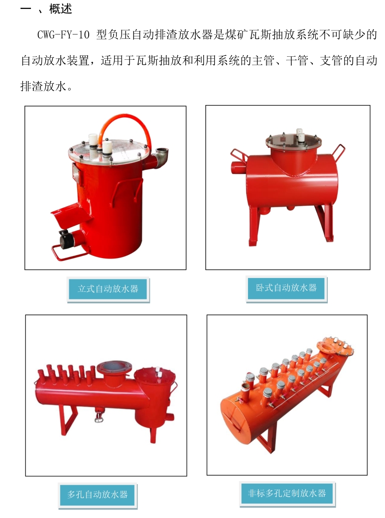 CWG-ZY型自动排渣负压放水,采用发兰连接,是煤矿瓦斯抽放系统不可缺少的自动放水装置,适用于瓦斯抽放和利用系统的主管、干管、支管的自动排渣放水。